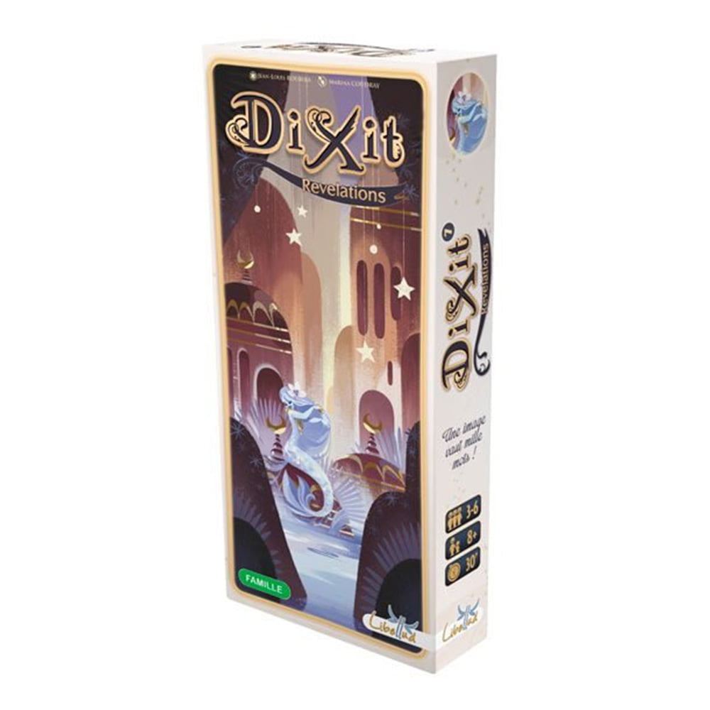 Dixit Revelations, es una expansión que contiene 84 nuevas cartas con un arte fantástico y surrealista. Incluye 21 cartas doradas.